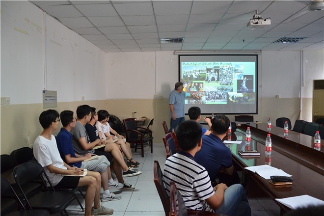 会上,Boone教授首先介绍科罗拉多州立大学所在城市科林斯堡——一个被誉为美国最适宜居住的城市,并从人口、气候、交通等方面强调了科罗拉多州立大学所处位置的优越性。随后,Boone教授依次从学生服务、流域科学学位、学院知名学者、WCNR亮点等方面为在座师生介绍了科罗拉多州立大学特色学院之一——自然资源与环境学院,并就学院的学科特色优势进行重点介绍。此外,Boone教授引用老子的“千里之行,始于足下”这句话,告诫大家学术研究不应单单纸上谈兵,而应立足于实践。