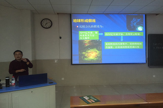 11月14日,资源与环境学院老师赵强在主校区第11教学楼2段102号教室为同学们带来一场题为“地壳演化简史”的学术讲座。全体2016级地理科学专业学生到场参加。