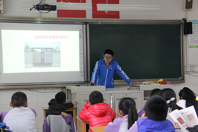 10月31日,济南大学资源与环境学院青年志愿者协会的志愿者们走进育贤小学开展“废旧电池的危害”宣讲活动。