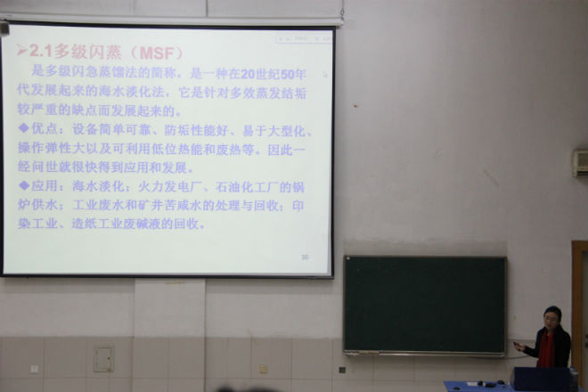 讲座中,王秀菊老师首先点出了国家当前水资源严重匮乏及其污染与浪费等突出问题的严峻形势,她指出水与同学们的日常生活息息相关,它不仅仅在外界,更存在于人的身体中,以此呼吁在座同学将节约护水行动进行到底。随后,王老师就自然界中水的循环过程以及水处理技术两方面展开着重讲解,她表示循环冷却水回用,海水和苦咸水淡化等各种水处理技术在水再用、海水和咸水淡化中的应用已越来越广,并为社会所公认。最后她提出得利于国家最近推出的河长制,黄海及国家周边临海的水质已经有显著提高,相信随着各种水处理技术的不断进步和不同技术的集成,水的循环再用会越来越充分,其在水资源领域应用的效果会越来越好,作用会越来越大,前景越来越广阔。