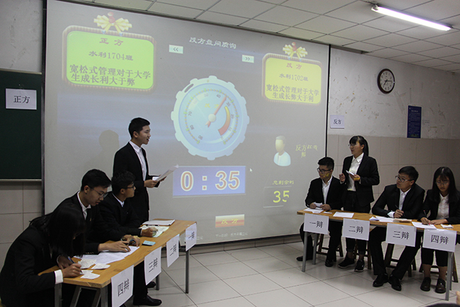 决赛辩论话题是“宽松式管理对于大学生是利大于弊还是弊大于利” ,对战双方分别是正方水利1704班和反方水利1702班。继短暂的自我介绍后,比赛进入立论陈词环节,正方认为宽松式管理可以引导学生自主学习,丰富校园生活,正方辩手立场鲜明,慷慨陈词,以充分的事实依据论证了这一观点。水利1702班反方代表也不甘示弱,他们认为宽松式管理会影响同学们的规律生活,容易使同学们养成听课不认真、沉迷网络游戏等坏习惯,反方辩手逻辑清晰,从容镇定,有力地反驳了正方观点。在自由辩论环节,正方三辩精辟的措辞、犀利的言辞,展现出咄咄逼人的气势,赢得现场阵阵掌声。
