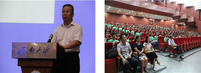 院长徐征和从“大学是什么”这一实质性问题引题出发,用丰富的案例、翔实的数据,向新生详细介绍了我校辉煌的办学历史、卓越的办学成就、宏伟的战略目标,加深了同学们对学校的认识与了解,增强了新生成为一名济大人的自豪感和荣誉感。随后,又针对资源与环境学院的发展历程、学科建设、专业设置、师资队伍建设、在校生发展与就业等情况作了讲解。徐院长以习近平总书记的“有梦想,有机会,有奋斗,一切美好的东西都能创造出来!”这句话做总结,鼓励学生把握大好时光,坚持梦想,努力拼搏,不断提升自我价值。