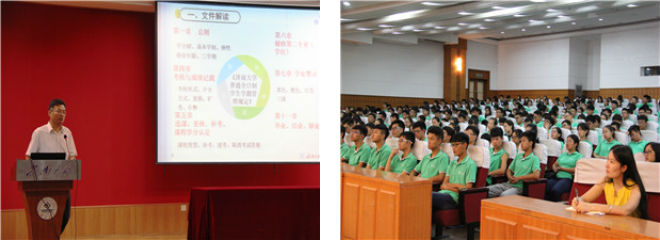 为帮助新生能够尽快了解大学的学习要求、学习方式、学习特点,以推动其更快更好地适应崭新的大学生活,杨院长重点从学习学业等方面所涉及的内容进行讲解。尤其对学生普遍迷茫的在校成绩考核与记载、课程学分的认定规则与要求、第二专业的辅修规定、学业警示的相关文件要求及补考、重修、毕业、结业、肄业等相关内容进行了重点解析。细致全面且深入浅出的解读为学生拨开了迷雾,解开了学生之前的多种疑问与困惑,加深了大家对在校学习与生活的理解,对学生四年的大学生活起到了直接的引领意义。