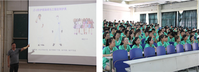 讲座伊始,王老师从五个方面向新生重点讲述了实验室的安全问题:一、制度安全,同学们在进实验室之前要熟读《大学生实验守则》;二、场所安全,实验室中存在火灾等危险情况发生的可能,提醒同学们一定要有防范意识;三、应急安全,实验室中都配有灭火器,同学们无论是否进实验室都应学会使用灭火器;四、设备安全,实验室中的高危设备有酒精灯、电热炉、高温炉、干燥箱等,要谨慎使用各类设备;五、个人防护安全,同学们在实验室里要注重饮食卫生与安全、服装和护具、手套的应用等问题。王老师还向大家演示了一些面对实验事故正确的应急反应。