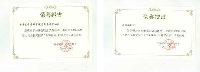 5月21日上午10点,齐鲁晚报、齐鲁志愿者于解放阁举办2016年度公益活动优秀团体及优秀个人表彰活动,资源与环境学院青年志愿者协会代表及相关人员到场参加,学院青年志愿者协会获“优秀团体”荣誉称号,王晓璐同学获“优秀个人”荣誉称号。
