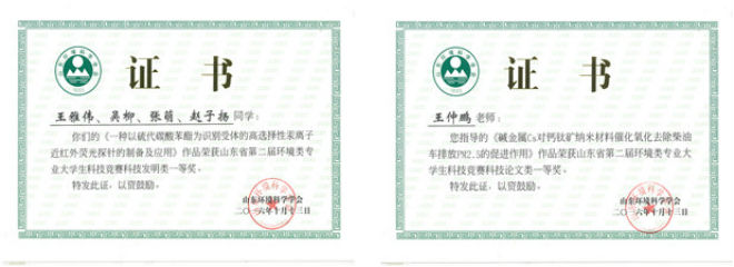 近日,山东省第二届环境类专业大学生科技竞赛落下帷幕,济南大学资源与环境学院共九项成果获优秀作品荣誉称号。其中王亚伟、吴柳、张萌、赵子扬同学的《一种以硫代碳酸苯酯为识别受体的高选择性汞离子近红外荧光探针的制备及应用》获得科技发明类一等奖,邵文、张英南、苗菲、金士楷的《碱金属Cs对钙钛矿纳米材料催化氧化去除柴油车排放PM2.5的促进作用》等共八项作品荣获科技论文类奖项。
