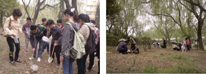 上午8时,同学们集体来到九教后河岸在老师的组织下开展了土壤剖面观察,做好识别土壤、研究土壤的基础工作。实践开始前,邵老师向同学们详细介绍了实验器具的使用方法以及实验目的;在老师的认真讲解之后,同学们开始寻找合适的剖面点进行土壤采集,通过测量土壤pH值来了解土壤性质,并对所选择的剖面点进行观察,记录颜色、质地、结构、孔隙等土壤特性。在实践过程中,邵老师耐心的对土壤的观察进行了现场指导。下午,邵老师带领同学们来到青龙山下,由同学们自由选择土壤剖面点开始观察各个年代的土壤剖面,通过对不同地区不同剖面的研究,巩固了同学们的课堂知识,走进大自然,提高同学们的专业兴趣。