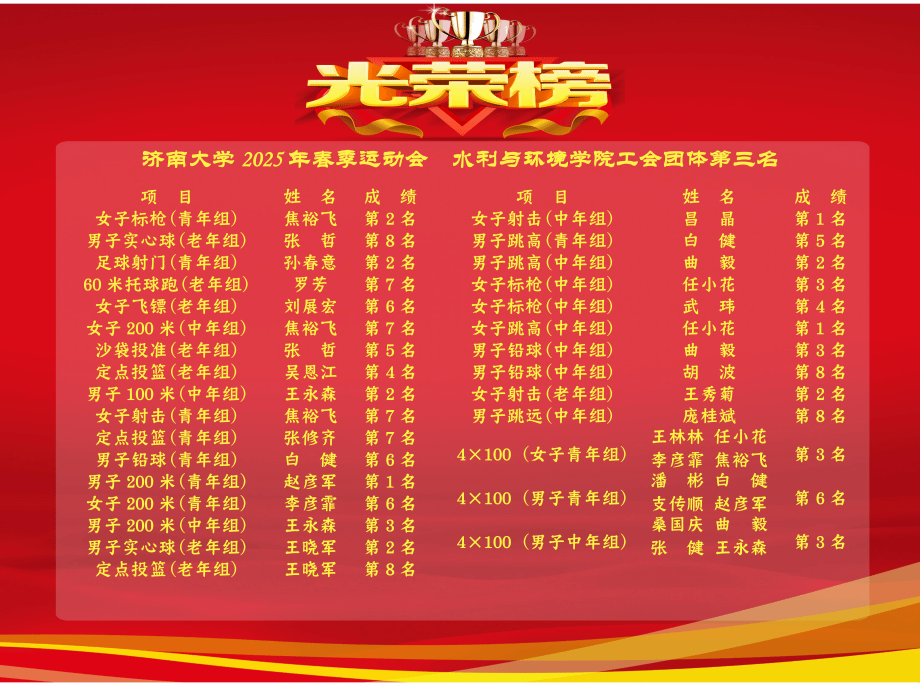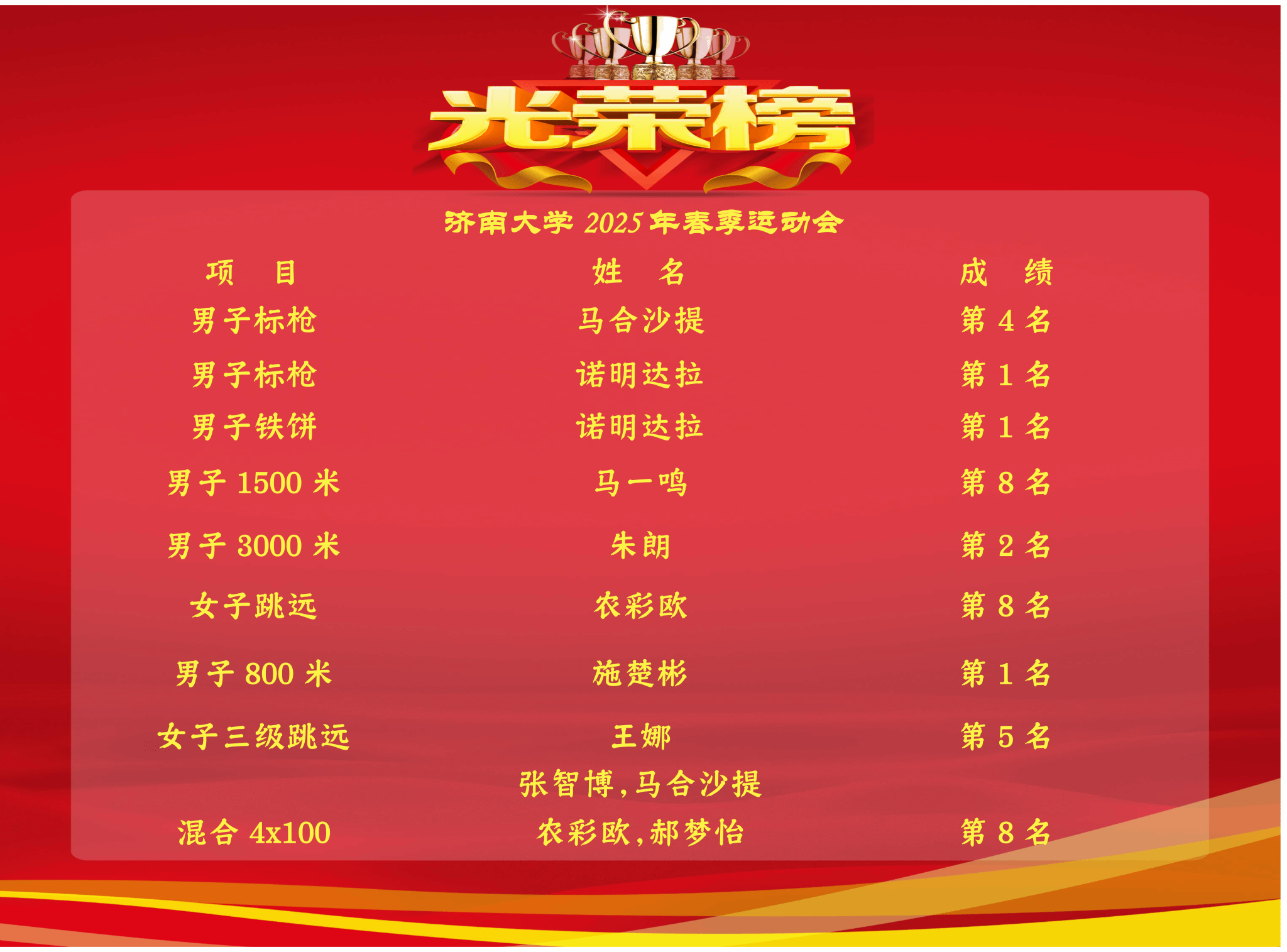 2025年4月29日至30日,济南大学春季田径运动会在北苑操场隆重举行。学院教职工与学生团结协作、奋勇争先,荣获学生甲组体育道德风尚奖、教工大基层工会团体总分第三名,充分展现了学院积极向上、团结奋进的体育风采和拼搏精神。