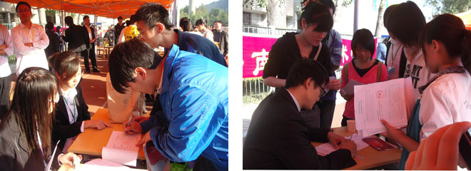 为了使新生在最短的时间按照最快捷的方式完成报到手续,学院对各部门的工作都做了周密的部署。本次新生报到流程主要分为报到注册、证件核对、缴费确认、领取校园一卡通和办理住宿手续,此外,学院在迎新点还设立了报道流程表发放处、家长休息处、行李摆放处、运送行李专车等,为新生及家长提供了全方位的服务。早上6时左右,我院三大组织成员就已穿戴统一地开始了搭建迎新服务点的准备工作。新生报到过程中,值班同学各司其职,积极地把自己负责的工作认真落实到位;同时,工作人员热情地接待了11级的新生,在引导他们办理完报到手续后,安排他们前往各自的宿舍。迎新过程中,我院党委书记兼院长马振民、党委副书记兼副院长陈卫东、副院长徐征和、副院长闫良国及团委书记李蘋等学院领导和11级辅导员黄茜老师也来到了迎新现场,对迎新工作进行了指挥,并对新生及家长表达了来自学院的欢迎,对现场服务人员表示了慰问。