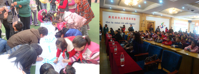 此次活动分为室内与室外两大部分。室内会议中,首先由高校志愿者担任主持人介绍了出席此次活动的相关领导及此次活动的意义。随后,志愿者用ppt的形式给十亩园小学的学生们进行了森林保护、垃圾分类等的展示。展示涉及的森林砍伐、动物失去家园、一次性产品的消费、垃圾分类等内容,让学生了解了低碳的重要性,使他们树立了垃圾分类处理的意识。在展示中,穿插的“猜猜我是谁”游戏,更加深了大家对环保知识的印象。会议最后,山东省环保基金会穆局长对活动进行了总结,充分肯定了这次活动的重要性,并对五大高校提出了表扬。室外活动以游戏的形式进行,十人每组且每两人夹球进行接力,活动用球上印有ppt中提到的相关事例。这让孩子们在游戏的同时学到了环保知识,学到了环保从身边的小事做起。随后,志愿者向学生们赠送了礼品以资鼓励。最后,活动在孩子们欢乐的笑语声中结束。