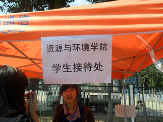 为辅助学院迎接新生,更方便新生报到,资源与环境学院在南院设点,专门迎接入住学生。