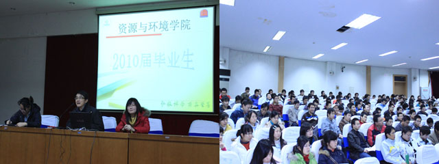 12月8日上午9:00,资源与环境学院在东区报告厅召开了毕业生就业指导会议。学院学办全体工作人员以及2010届全体毕业生参加了此次会议。会议由学院团委书记李蘋老师主持。