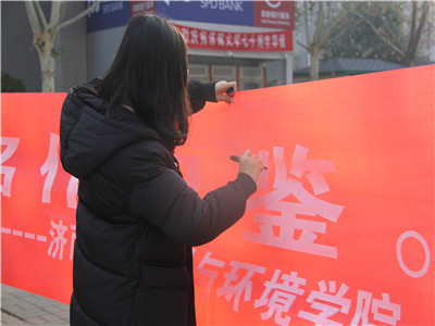 上午九时,志愿者们准时到达第八食堂广场,准备进行签字活动。三名志愿者拿着内容为“以屠刀铸警钟,以逝名作史鉴”的条幅,其余同学站成两列,按顺序依次在条幅上签下自己的名字以表同学们不会忘记这段屈辱的历史以及会努力为国家的伟大复兴奉献出自己的力量。条幅上的每个字,都是整齐划一的,彰显出同学们的用心以及对先辈们崇高的仰慕。然后,志愿者们站在条幅后合影留念,为活动画上圆满的句号。虽然同学们已经观看过有关南京大屠杀的影片,已经了解了先辈们曲折的历史,但是这次活动以条幅签字的形式使同学坚定了要铭记那段历史的决心以及极大的激发了同学们的爱国情怀。