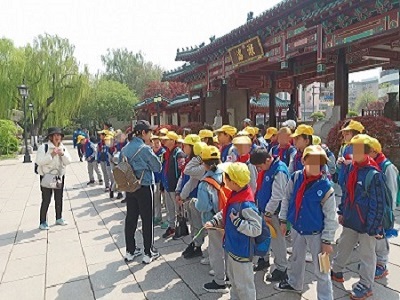 上午十点,志愿者们准时到达趵突泉,为景泉中学四年级的同学们带来一场绘声绘色的知识志愿讲解活动。首先,志愿者通过提问的方式调查同学们对趵突泉的历史文化了解程度,发现同学们对此只是略知一二。针对同学们的知识盲区,志愿者们将趵突泉的历史来源告诉同学们,讲解结束后,同学们都表示他们对趵突泉有更进一步的认识。随后,志愿者们带领同学们参观趵突泉内的著名景点,在游览过程中,同学们被薄雾蒙蒙的晴雨溪、古意盎然的泺源堂、隽丽雅致的李清照纪念堂深深地吸引到,特别是当同学们游览到李清照纪念堂时,很多同学都停下脚步并环顾四周,细细地品味李清照所遗留下来的诗词及画作。看出同学们对李清照充满好奇,志愿者们便向他们介绍李清照的生平事迹,当志愿者们说到李清照是济南人的时候,同学们都感到很自豪并且说道在以后的学习生活中他们要以李清照为榜样,脚踏实地,刻苦地学习。