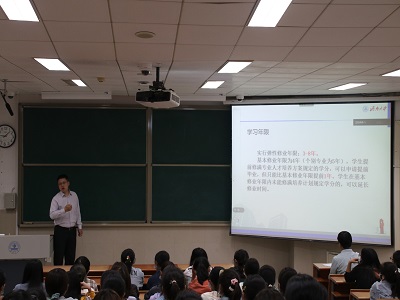 首先,刘处长从学分制的实施背景和主要内容为新生介绍济南大学学分制相关情况。济南大学积极响应山东省推进高等学校教育教学和人才培养模式改革的号召,是山东省首批实行学分制改革的高校之一。学分制是指学生取得的学分数作为衡量和计算学生学习量的基本单位,以达到基本毕业学分作为学生毕业主要标准的教学管理制度。随后,刘处长向同学们详细介绍取得学分的途径、选课、重修及考核、毕业和结业以及肄业和延长修业年限等。刘处长还为那些对第二专业比较感兴趣的同学们进行了简单的提议。最后,刘处长鼓励新生要热爱学习,激励同学们树立目标,以不同的方式学习,踏实奋进,为未来的工作就业打下坚实基础。