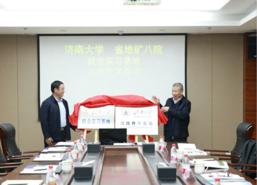 在签约揭牌仪式上李星传书记对济南大学各位领导和老师的到来表示热烈欢迎,并简要介绍了山东省第八地质矿产勘查院的单位概况和生产经营情况以及近几年取得的主要成绩,就双方友好合作提出了强烈的意愿,希望不断加强沟通联系,共促发展,并希望通过就业实习基地和实践教学基地的建设为地方社会经济发展提供稳定的人才支持。徐征和院长介绍了济南大学德赢VWIN学院的学科建设、学生规模、实验室建设等发展情况,他指出,需进一步加强校企合作,促进产、学、研相结合,并希望以建立就业实习基地和实践教学基地为契机,加强与山东省第八地质矿产勘查院的深度合作与交流,不断完善实践教学体系,增强学生及教师的实践能力、创新能力,提高本科生人才培养质量。