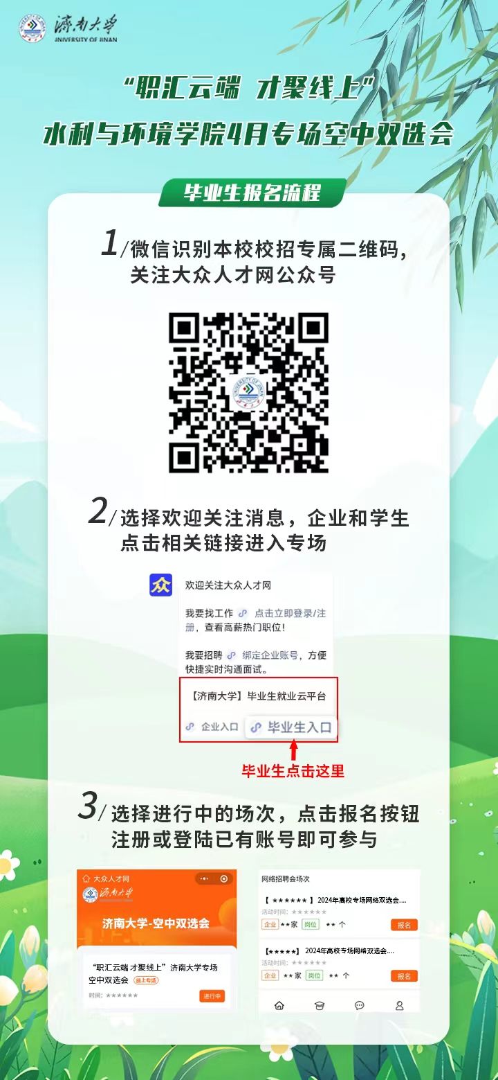 手机微信扫码关注“大众人才网”微信公众号,企业和毕业生分别点击相关按钮进入济南大学校招端口,点击本学院报名按钮,注册或登录已有账号即可直接参与。