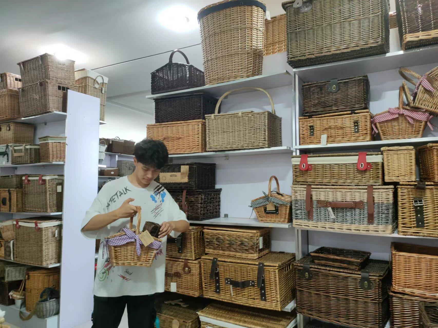 上午10点,吴泓霖到达了临沭县晴朗工艺品有限公司,公司副经理刘师傅带领并指导团队参观公司展区。在刘师傅的带领下,吴泓霖来到陈列着各式各样工艺品的二楼产品展示区。在这里,刘师傅对不同类别与不同特色的工艺品进行了专业的讲解,用通俗易懂的语言阐述了每件作品的制作工艺与灵感来源。吴泓霖体会到了临沂传统柳编艺术与现代多元文化相结合所产生的惊人魅力。他在认真倾听的同时也通过拍摄照片与录音的形式针对各种产品信息进行了系统的收集,收获了许多有价值的资料。参观结束后,吴泓霖针对公司未来的发展、柳编这类非遗工艺品的发展和柳编公司对当地乡村振兴的影响等方面问题向刘师傅展开提问。吴泓霖深刻感受到了柳编产业的独特魅力,在未来,柳编产业的发展会吸引更多的外来资本和高素质人才,进而会带动临沭县的整体发展。