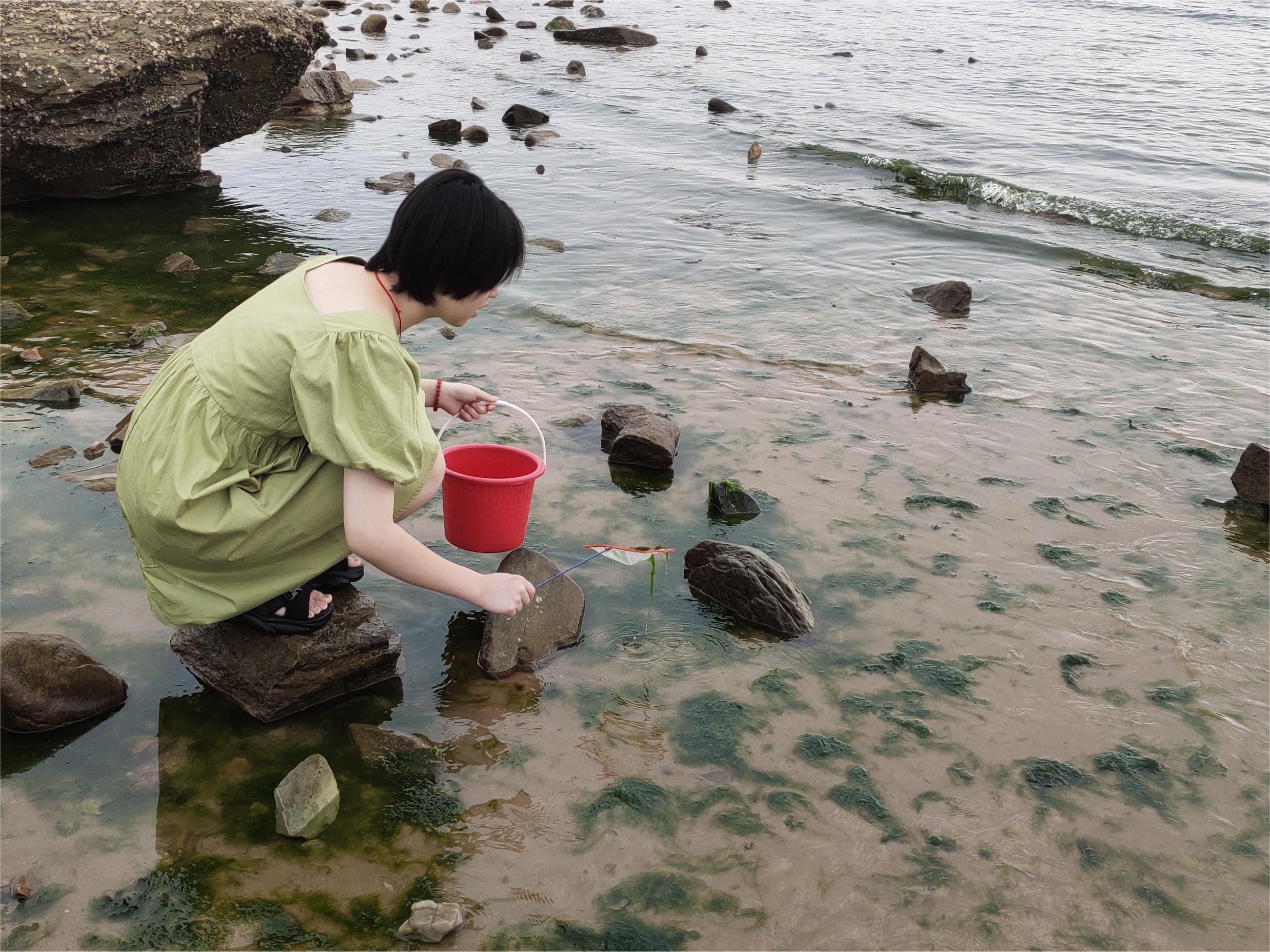 7月27日上午,实践团队成员到达了第三海水浴场。为了对浒苔的处理方式有更好的了解,团队成员对岸边浒苔清理的专业人员进行了采访。通过采访得知:青岛浒苔爆发高峰期一般为夏季,这也是整治浒苔的重要时期。目前青岛市的主要治理措施是设置四道防线。第一道防线是海上前置打捞线;第二道防线是海域前出拦截线;第三道防线为重点海域拦截线;第四道防线是浅海岸边清理线。通过“海上打捞、近岸阻拦、岸域清理”的方式进行处置。据统计,目前对于浒苔的处理方案主要还是化学和物理的方法,通过利用化学药品和放置拦截网减少其出现在岸上的数量。但这很难真正去从根本上去解决浒苔的爆发。因此,团队成员决定下海捞取一定数量的浒苔样本进行更加深入的研究。成员共分成三组,每个小组都前往了不同的区域进行采样。采样期间大家使用提前准备的装备进行浒苔捞取,将捞取的样品装入保鲜袋中密封保证样品的新鲜程度,以便后续研究。经过了几个小时的调研与实践,成员们对于浒苔有了更多的了解,对于打捞用的渔船,网具等也有了全新的认识,更是对于海岸生态保护有了更加深入的思考,这些对于每位同学日后的专业学习、实验操作、理论实践等都有极大地帮助。