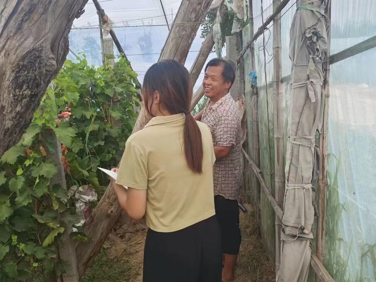 成员赵欣彤在河北省邢台市广宗县的葡萄小镇进行实地调研。调查发现,当地土质多为沙质土壤,透气性、排水性好,非常适宜种植葡萄。据村民介绍,该村种植的葡萄20余个品种,种植面积达1500余亩。大棚集中连片,统一管理,提高生产效率的同时,也有利于形成一体化的产业集群。村民反映,在专家科学管理、网购平台的双重帮助下,葡萄产量和销量都十分可观。