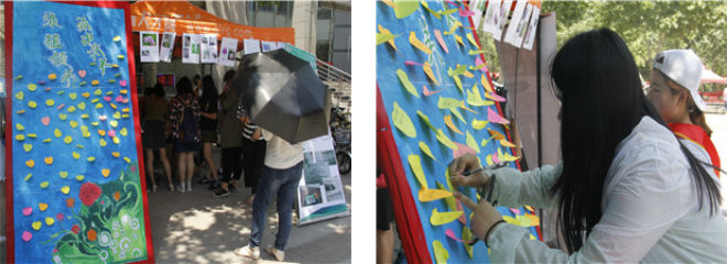 活动前期,资源与环境学院格润环保协会在微博、腾讯等网络线上平台进行广泛宣传,活动引起了同学们的极大反响。活动正式开始前,就已经有许多同学慕名而来。志愿者号召现场参与的同学们在展板上写下与环保有关的小知识,用以兑换薄荷、薰衣草、满天星等植物种子和种植工具,活动进行到一半,展板上就贴满了同学们贡献的环保小妙招。许多参与了线上集赞换多肉的同学也来到现场参与活动。活动现场人来人往,尽管天气炎热,但同学们依然热情高涨。来往的同学们积极踊跃的参与到互动环节中,为环保事业出谋划策,现场气氛热烈,活动顺利结束。