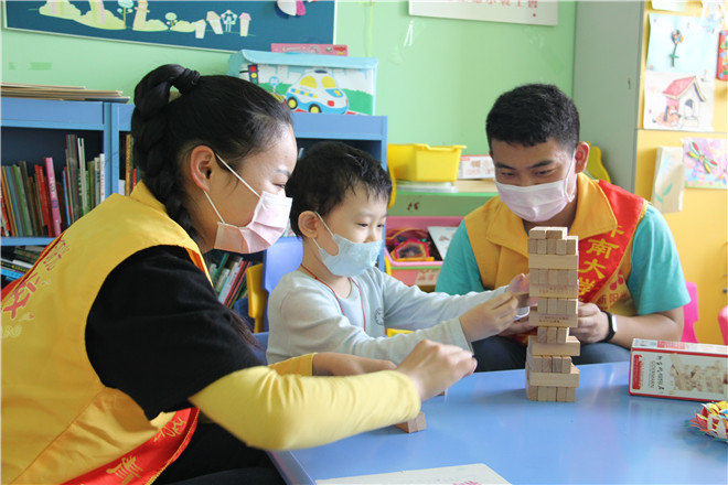 下午两点半,志愿者们准时到达阳光病房,对整间教室进行打扫、消毒,并在班级负责人的指导下准备教学材料。下午三点半,小朋友与家长陆续来到新阳光病房,志愿者安排大家坐好后,给小朋友发放纸质花朵、染料、积木等物品。志愿者通过发放的物品与小朋友们拉近关系,一块儿做游戏。在做游戏的过程中:志愿者教小朋友们用普通话表达各种染料,鼓励他们充分发挥想象力绘制自己喜欢的东西,并用普通话表达自己的想法;拼积木时,志愿者在打闹声中纠正他们的发音,每个人的脸上洋溢着幸福的笑容,关系十分融洽。下课后,小朋友们与志愿者挥手告别,并邀请他们下次再来。