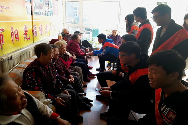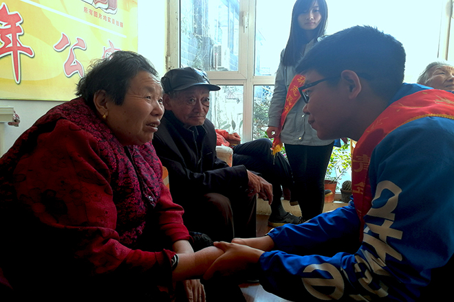 上午九时,志愿者们到达阳光福缘老年公寓,见到了在院子里活动的老人。见到志愿者的老人们兴致高昂,连唱三首歌以表达对志愿者到来的欢迎,动听的歌声把所有人带回到那个勤劳奋斗的年代。随后志愿者们为老人们带来合唱、相声等节目,引得老人们笑声不断。一阵欢乐过后,志愿者们陪老人们聊起家常,一边为老人们揉肩,一边听老人们讲述这个城市的变化和现在生活的美好。这些对话令志愿者们感受颇深,他们纷纷表示幸福生活来之不易,一定会珍惜现在的美好时光,同时志愿者们也向老人们讲述了自己丰富的大学生活。最后老人们鼓励志愿者们要关心历史,努力学习文化知识,切勿荒度青春年华。