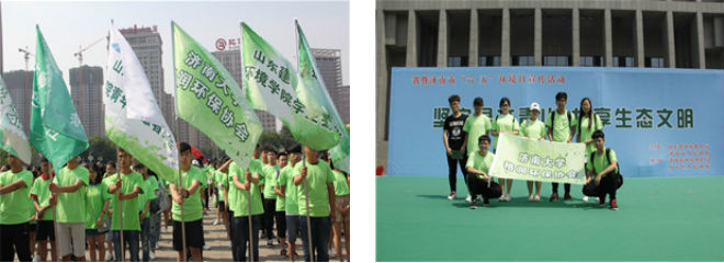 上午九点志愿者们准时来到活动地点,首先志愿者们在活动广场参观了环保成果展板,了解了山东省的环境保护工作,并观看济南市小学生环保创意绘画展示。随后志愿者们与其他学校的环保志愿者一起参加了宣传仪式,仪式上省、市领导为首批省级“齐鲁环保小卫士”、第六批省级“绿色社区”代表颁发证书和奖牌,省环保厅厅长王安德为“驻济高校大学生环保志愿者联盟”、“山东省环保厅青年志愿者服务队”授旗。《山东新闻联播》主播、山东环保形象大使毛馨与青年环保志愿者代表以诗朗诵形式发起环保倡议,号召大家坚守绿水青山,共建生态家园。