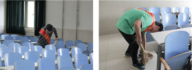 中午十二点,志愿者们早早来到十教。在服务队队长统一分配任务、强调注意事项与安全问题后,同学们怀着饱满的热情参与到志愿服务中。教室的脏乱没有影响志愿者们的打扫热情。志愿者们团结协作,相互配合,不怕脏,不喊累,很快教室被志愿者们打扫一新,桌斗内的果皮垃圾被清理干净,地面上的废纸广告都不见了踪影,黑板地面也被擦的纤尘不染。志愿服务最后,同学们将垃圾打包,整理好卫生工具,尽管额头上渗出点点汗珠,大家脸上依旧洋溢着幸福的笑容。