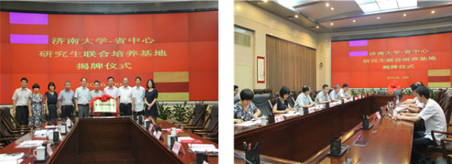 仪式上,济南大学副校长陈月辉和济南市市政公共事业局总工程师姜春华为“济南大学-山东省城市供排水水质监测中心研究生联合培养基地”揭牌。学校和监测中心各位领导合影留念。