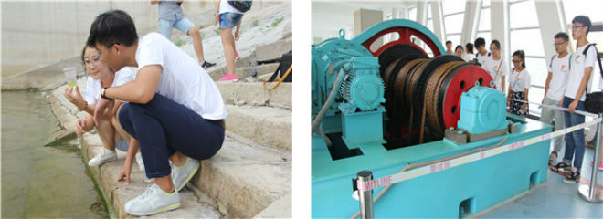 上午十点,调研团队员在卧虎山水库管理人员的带领下进入水库。取样小组下到水库边用取样器在多个取样点完成水样采集,通过观察水质浑浊度和PH值对水质进行了初步检测。在对水样进行分类存放后,队员们跟随工作人员深入水库控制操作间,观察学习溢洪闸的工作原理。这是同学们第一次近距离的观察水库内部构造,工作人员认真的向同学们讲解水库各部分的建筑原理和工作流程。在汛期水库会安排24小时值班杜绝安全隐患,同学们深深感受到水库技术人员的责任重大。提起周边的水质变化的问题,工作人员十分迫切的希望能早日采取有效措施改善日益恶化的环境。面对前辈们迫切的心情,队员们更加坚定了帮助当地人改善环境状况的决心。