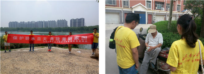 上午,实践团队员们到达水街,对当地的环境现状和居民对当地环境污染的认识进行了问卷调查。实践团队员在河边采集水样,为下一步研究水质状况做好准备。随后,队员们有的在路边向居民发放关于环境污染问题的调查问卷和环保倡议书;有的深入周围小区,与当地居民亲切交谈。队员们组织了环保知识问答活动,发现多数居民环保意识比较薄弱,只着眼于生活所需。队员们了解到,近几年当地的环境污染问题有所解决,居民的生活环境也得到了一定程度的改善,但仍存在一些乱扔垃圾、污水入河等问题,保护环境仍然是重中之重。