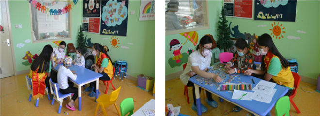 下午两点半,志愿者们抵达目的地,开始进行病房学校的例行消毒工作。志愿者用酒精棉球对桌椅以及玩具进行擦拭,并对地面进行清洁消毒。下午三点,打完点滴的小同学们陆续来到病房学校,其中一位小朋友因为母亲制止他过度看电视而闷闷不乐,志愿者积极开导,耐心安抚小朋友低落的情绪。接下来正式开始上课,志愿者为孩子们准备好颜料和画材,手把手地教他们画活泼可爱的小动物。孩子们发挥无穷的想象力,运用七彩颜色画出斑斓世界。与志愿者们共同完成拼图游戏,搭积木游戏后,志愿者们和孩子们一一告别,整场活动在孩子们欢声笑语中愉快结束。
