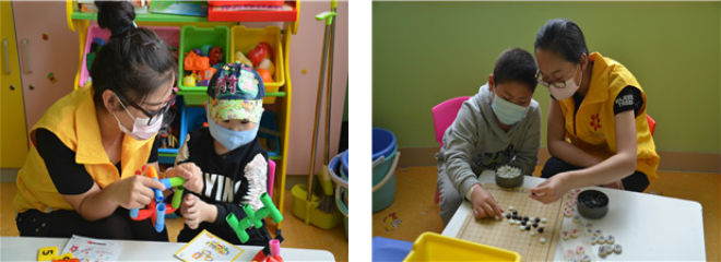 下午三点,志愿者们早早来到病房学校,进行了全面的消毒工作与病房学校的志愿老师一起迎接小朋友们的带来。打完点滴的小朋友们陆续来到病房学校,三点半语文课正式开始。志愿者们绘声绘色地教孩子们朗读课文,陪孩子们练习书法。孩子们的字因为小手刚打完点滴而歪歪扭扭,志愿者们耐心帮助孩子们练习。语文课完成以后,小朋友们在志愿者的陪伴下搭乐高积木,下五子棋。玩闹中小朋友们不时发出欢快的笑声让在场的志愿者们心中十分温暖。放学时间到了,许多小朋友被父母接走接受治疗,面对恋恋不舍的小朋友,志愿者们承诺下周还会去看他们。小朋友们走后志愿者们打扫整理了房间。