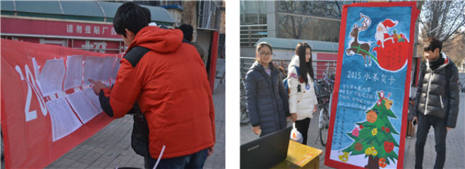 本次活动由香港环保协会主办,格润环保社团资源与环境学院承办,以低碳环保的理念,联合了国内300余所高校共同参与。同学们可选择苹果、橙子等不同水果种类通过创意涂鸦,寄给想送的其他高校朋友,朋友会在圣诞节当天收到创意水果和满满的祝福。活动不仅通过选择水果作为原材料来减少纸质、包装的使用,同时与全国300多所高校合作,相互提供订购信息并及时帮助同学们送达礼物,达到节省运输费用、时间和环保的目的。同学们对此次创意活动充满热情,在活动地点前来参加的同学络绎不绝,都想通过这种独特环保的方式给远方的朋友送去温暖,希望他们在圣诞当天收获一份惊喜与感动。