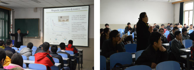 上午八点半,报告会在十教304正式开始。闫良国副院长首先向大家介绍了强游教授,并对强教授的到来表示欢迎。强游教授现为美国爱达荷大学物理学终身副教授,主要从事纳米团簇组装材料的合成及磁性纳米技术的应用等领域的研究工作。报告伊始,强游教授分别就核燃料成分、核能在能源中的地位、核反应原理及核废料的危害与治理方法等方面进行了简明扼要的讲解。随后,强教授重点介绍了磁性纳米材料去除放射性核素和重金属的研究过程和研究结果,说明了磁性纳米材料的优点以及它在能源循环利用、环境科学修复中所发挥的重要作用。最后,在场师生纷纷积极踊跃进行提问,强游教授进行了耐心解答并同在座各位展开热烈讨论。