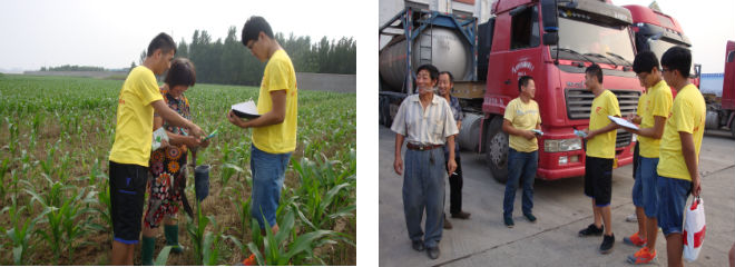 7月6日一早,本着实事求是的态度,实践团首先来到了村内的街道上,对一些老人进行了采访,了解关于乡镇企业污染对居民日常生活的影响,并询问他们对此事的态度。访问过程中实践团成员还通过向农民发放宣传册来普及环保知识,并了解到由于乡镇污染企业的发展,村民们的日常用水受到污染甚至饮水都受到严重影响。然后,实践团又走进乡间,了解乡镇企业污染对于农作物生长收成的影响。下午,队员们又来到东营市大王镇金岭集团(化工厂),对运输、车间工人进行了采访,大家表示虽为了发展经济,但也认识到了环境污染问题,工厂也在改良技术以保护环境。