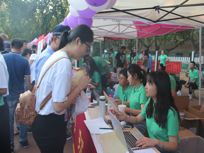 在新生报到区,由学院党员先锋、学生联合会成员等百余名同学组成的迎新服务团队在北苑操场新生接待处全天候接待新生,为新生家长设置休息区,并提供新生报到注意事项咨询服务。