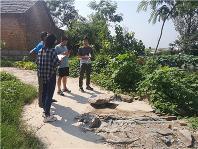 8月18日上午,团队全体成员在金乡县水利局集合完毕。接着,团队从水利局了解到调查村落的基本情况。下午,在水利局工作人员的带领下,团队成员先后前往卜集镇的白坨村和张八缸村进行实地考察。来到村委会,成员们从村里的户数、耕地面积、地势高低、河道情况、下雨排水情况、危险区以及水利设施的齐全程度等方面进行详细询问。了解完基本的信息后,团队成员对村子里受降雨影响较大的住户进行仔细地询问,并围绕村子里的小沟、暗渠、排水系统进行逐一考察拍摄并纪录。