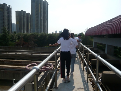 四点左右,气温稍低,我们出发前往污水来源处,去探索污水的“蜕变”。首先我们到达一级处理段,这里的机械处理工段包括格栅、沉砂池、初沉池等构筑,经过这之后,污水中的悬浮物,大颗粒就不见了。然后进入的是二级处理段,污水生化处理属于二级处理,这里只见一个个栅格,里面有不少的泥沙在翻滚,这是活性泥,里以去除不可沉悬浮物和溶解性可生物降解有机物为主要目的,经过这一级后,污水变得更加清澈,再往后走来到了三级处理的地方,我们了解到三级处理是对水的深度处理,是继二级处理以后的废水处理过程,是污水最高处理措施,经过这一级,水中的氮磷才能被除去,才能真正的被用作灌溉等重新便利人类生活。