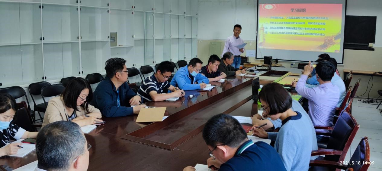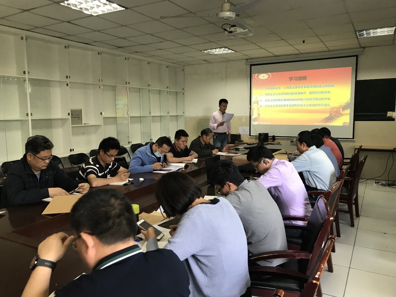 会上,边振老师带领全体党员集中学习了文章《中华人民共和国的成立和从新民主主义到社会主义的过渡时期》。该专题文章分别从(1)新中国的诞生,人民民主政权在全国范围的建立和巩固,(2)新民主主义改革和建设的全面展开,国民经济的恢复,(3)党在过渡时期总路线的提出和有计划经济建设的开始,(4)社会主义改造的基本完成和社会主义制度的初步建立四个方面,系统阐述了中国共产党自共和国诞生至社会主义制度初步建立期间,面对国内外严峻形势,卓有成效开展的一系列针对性的改革举措。各项举措巩固了革命的胜利成果,极大丰富了马克思主义的科学社会主义理论体系,为新中国的和平稳定发展奠定了坚实的基础。