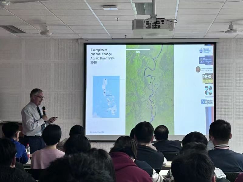 Trevor Hoey教授以“Predicting and Managing Flooding in the Tropics”(热带地区洪水的预测与管理)为主题,结合他在“改进菲律宾洪水风险评估”项目中的研究,就洪水预测与管理的重要性、研究方法以及未来发展方向进行了报告。针对菲律宾河流洪水频繁、带来的经济社会损失严重的问题,Trevor教授指出沉积物通量和地貌变化是菲律宾洪水风险的主要驱动因素。其次,详细介绍了洪水预测与管理研究的运作机制,包括利用FEH方法预测面积和日降雨量,结合新型激光雷达地形图对河道形态变化进行概化,并建立二维水流(HEC-RAS)与形态动力学模型来模拟河道水流泥沙,以探索河道防洪整治方案。最后,就热带地区洪水预测与管理存在的问题及改进方向进行了阐述。Trevor 教授的报告精彩纷呈,结束时赢得了师生们的热烈掌声。随后,师生代表纷纷举手提问,就报告中的专业问题展开了热烈讨论,现场气氛十分活跃。