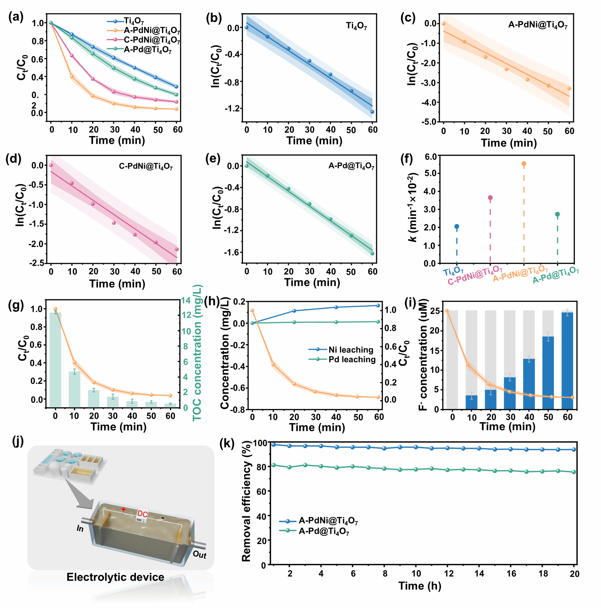 图 2 A-PdNi@Ti4O7电极及其在连续流反应器中的污染物降解性能