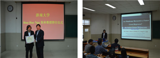 报告会伊始,杜斌副校长首先对Huu Hao NGO教授的到来表示热烈欢迎并为其颁发了济南大学客座教授聘书。受聘仪式后,吴教授向在场的资源与环境学院师生作了题为《Anaerobic membrane bioreactor for future green bioprocess》的学术报告。
