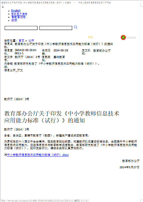 2014教育部办公厅关于印发《中小学教师信息技术应用能力标准(试行)》的通知